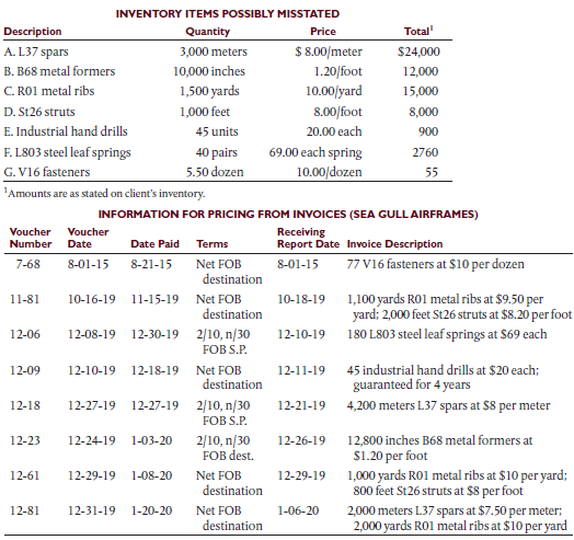 No. of Items Total Value More than $5,000 500 $4,150,000 Less than $5,000 4,500 4,125,000 5,000 $8,275,000 No. of Items Total Value More than $5,000 36 $360,000 Less than $5,000 7 2,600 INVENTORY ITEMS POSSIBLY MISSTATED Description Quantity Total' Price A. L37 spars 3,000 meters $ 8.00/meter $24,000 B. B68 metal formers 10,000 inches 1.20/foot 10.00/yard 12,000 C. RO1 metal ribs 1,500 yards 15,000 D. St26 struts 1,000 feet 8.00/foot 8,000 E. Industrial hand drills 45 units 20.00 each 900 F. L803 steel leaf springs 69.00 each spring 40 pairs 5.50 dozen 2760 G.V16 fasteners 10.00/dozen 55 'Amounts are as stated on client's inventory. INFORMATION FOR PRICING FROM INVOICES (SEA GULL AIRFRAMES) Voucher Voucher Receiving Report Date Invoice Description Number Date Date Paid Terms 7-68 8-01-15 8-21-15 Net FOB 8-01-15 77 V16 fasteners at $10 per dozen destination Net FOB destination 1,100 yards RO1 metal ribs at $9.50 per yard; 2,000 feet St26 struts at $8.20 per foot 180 L803 steel leaf springs at $69 each 11-81 10-16-19 11-15-19 10-18-19 12-06 12-08-19 12-30-19 2/10, n/30 12-10-19 FOB S.P. 45 industrial hand drills at $20 each; guaranteed for 4 years 12-09 12-10-19 12-18-19 Net FOB destination 12-11-19 2/10, n/30 FOB S.P. 2/10, n/30 FOB dest. 12-18 12-27-19 12-27-19 12-21-19 4,200 meters L37 spars at $8 per meter 12,800 inches B68 metal formers at $1.20 per foot 12-23 12-24-19 1-03-20 12-26-19 1,000 yards RO1 metal ribs at $10 per yard; 12-61 12-29-19 1-08-20 Net FOB 12-29-19 800 feet St26 struts at $8 per foot 2,000 meters L37 spars at $7.50 per meter; 2,000 yards RO1 metal ribs at $10 per yard destination 12-81 12-31-19 1-20-20 1-06-20 Net FOB destination