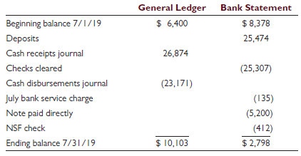 General Ledger Bank Statement Beginning balance 7/1/19 $ 6,400 $ 8,378 Deposits 25,474 Cash receipts journal 26,874 Checks cleared (25,307) Cash disbursements journal (23,171) July bank service charge (135) Note paid directly (5,200) NSF check (412) Ending balance 7/31/19 $ 10,103 $ 2,798