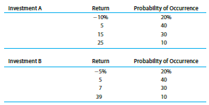 Investment A Return Probability of Occurrence -10% 20% 5 40 15 30 25 10 Investment B Return Probability of Occurrence -5% 20% 5 40 7 30 39 10