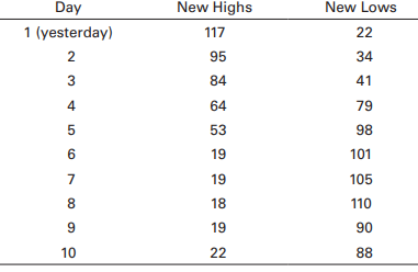 You are given the following information for the number of stocks making new highs and new lows for each day:
