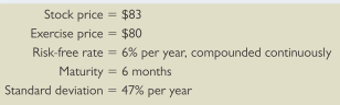 Stock price = $83 %3D Exercise price = $80 Risk-free rate = 6% per year, compounded continuously Maturity = 6 months Standard deviation = 47% per year