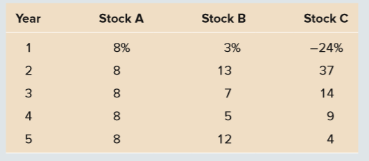 Year Stock A Stock B Stock C 1 8% 3% -24% 2 8 13 37 3 7 14 4 8 8 12 4 00 00