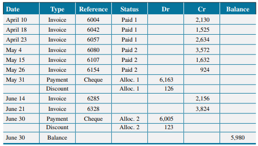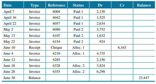 Date Туре Reference Status Dr Cr Balance April 10 Invoice 6004 Paid 1 2,130 April 18 Invoice 6042 Paid 1 1,525 April 23 Invoice 6057 Paid 1 2,634 May 4 Invoice 6080 Paid 2 3,572 May 15 Invoice 6107 Paid 2 1,632 May 26 Invoice 6154 Paid 2 924 May 31 Раyment Cheque Alloc. 1 6,163 Discount Alloc. 1 126 June 14 Invoice 6285 2,156 June 21 Invoice 6328 3,824 June 30 Рayment Cheque Alloc. 2 6,005 Discount Alloc. 2 123 June 30 Balance 5,980 Date Туре Reference Status Dr Cr Balance April 7 April 16 Invoice 6004 Paid 1 2,130 Invoice 6042 Paid 1 1,525 April 22 Мay 2 Invoice 6057 Paid 1 2,634 Invoice 6080 Paid 2 3,752 Мay 13 Invoice 6107 Paid 2 1,632 May 22 Invoice 6154 Paid 2 924 June 10 Receipt Cheque Alloc. 1 6,163 June 4 Invoice 6210 Alloc. 1 4,735 June 12 Invoice 6285 2,156 June 18 Invoice 6328 Alloc. 2 3,824 June 28 Invoice 6355 Alloc. 2 6.298 June 30 Balance 23,447