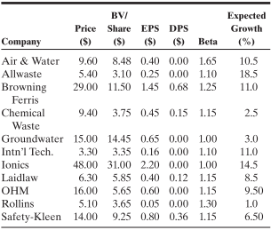 BV/ Expected Growth Price Share EPS DPS Company ($) (S) ($) (S) Beta (%) Air & Water 9.60 8.48 0.40 0.00 1.65 10.5 Allwaste 5.40 3.10 0.25 0.00 1.10 18.5 Browning Ferris 29.00 11.50 1.45 0.68 1.25 11.0 Chemical 9.40 3.75 0.45 0.15 1.15 2.5 Waste Groundwater 15.00 14.45 0.65 0.00 1.00 Intn'l Tech. 3.0 3.30 3.35 0.16 0.00 1.10 11.0 Ionics 48.00 31.00 2.20 0.00 1.00 14.5 Laidlaw ОНМ 6.30 16.00 5.85 0.40 0.12 1.15 8.5 5.65 0.60 0.00 1.15 9.50 3.65 0.05 0.00 1.30 9.25 0.80 0.36 1.15 Rollins 5.10 1.0 Safety-Kleen 14.00 6.50