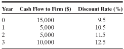 Year Cash Flow to Firm ($) Discount Rate (%) 15,000 5,000 5,000 10,000 9.5 10.5 11.5 3 12.5