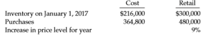 Cost Retail Inventory on January 1, 2017 Purchases Increase in price level for year $216,000 $300,000 480,000 9% 364,800