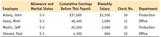 Allowance and Cumulative Earnings Biweekly Before This Payroll Employee Marital Status Salary Check No. Department Ackery, John S-3 $37,600 $1,500 30 Production Geary, Nicki S-1 48,400 1,990 31 Office Martin, Jeff S-2 65,200 2,060 32 Production Sherard, Paul S-1 4,300 860 33 Office