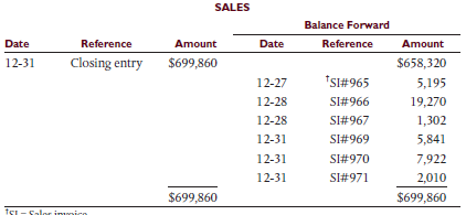 SALES Balance Forward Date Reference Amount Date Reference Amount 12-31 Closing entry $699,860 $658,320 12-27 tSI#965 5,195 12-28 SI#966 19,270 12-28 SI#967 1,302 12-31 SI#969 5,841 12-31 SI#970 7,922 12-31 SI#971 2,010 $699,860 $699,860 tsi - Falor imunicr