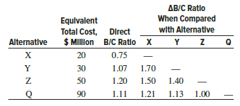 > Three alternatives identified as X, Y, and Z were evaluated by the B/C method. The analyst calculated project B/C values of 0.92, 1.34, and 1.29. The alternatives are listed in the order of increasing equivalent total costs. The analyst is not sure wheth