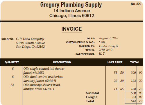 Gregory Plumbing Supply 14 Indiana Avenue Chicago, Illinois 60612 No. 320 INVOICE SOLD TO: C. P. Lund Company DATE: August 1, 20-- 5384 5210 Gilman Avenue CUSTOMERS P.O. NO.: Faster Freight 2/10, n/30 Н. Т. San Diego, CA 92102 SHIPPED BY: TERMS: SALESPERSON: QUANTITY DESCRIPTION UNIT PRICE TOTAL Olin single-control tub shower 6 faucet #44B652 Olin dual-control washerless 51 50 309 00 6 lavatory faucet #59B641 Olin massage shower head, antique brass #37B411 22| 20 133 20 12 11 56 138 72 580 92 63 80 644 72 Subtotal Freight Total