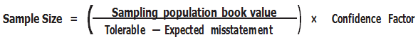 The sampling population book value is the total book value of all the items available to be selected in the sample.This total does not include items already removed for direct testing (i.e., all items greater than tolerable misstatement and other items selected based on size and/or risk characteristics).Tolerable misstatement is the greatest amount of misstatement that can be tolerated for the account being tested without concluding that the account is materially misstated. Expected misstatement is the amount of misstatement that the auditor expects to find in the account being tested.The âconfidence factorâ included in the above equation is determined based on the assessed risk of material misstatement for the account and the desired level of confidence from the sample. The confidence factor table below is from Garrett and Schulzkeâs sampling policy.