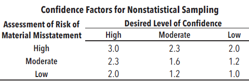 The sampling population book value is the total book value of all the items available to be selected in the sample.This total does not include items already removed for direct testing (i.e., all items greater than tolerable misstatement and other items selected based on size and/or risk characteristics).Tolerable misstatement is the greatest amount of misstatement that can be tolerated for the account being tested without concluding that the account is materially misstated. Expected misstatement is the amount of misstatement that the auditor expects to find in the account being tested.The “confidence factor” included in the above equation is determined based on the assessed risk of material misstatement for the account and the desired level of confidence from the sample. The confidence factor table below is from Garrett and Schulzke’s sampling policy.