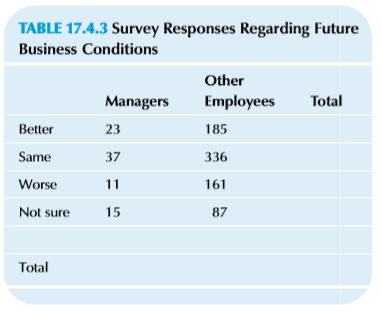 TABLE 17.4.3 Survey Responses Regarding Future Business Conditions Other Managers Employees Total Better 23 185 Same 37 336 Worse 11 161 Not sure 15 87 Total
