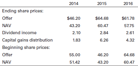 2014 2015 2016 Ending share prices: Offer $46.20 $64.68 $61.78 NAV 43.20 60.47 57.75 Dividend income 2.10 2.84 2.61 Capital gains distribution 1.83 6.26 4.32 Beginning share prices: Offer 55.00 46.20 64.68 NAV 51.42 43.20 60.47